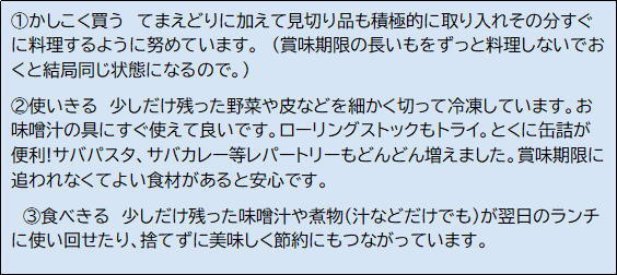 2000年度比で2030年度までに家庭系・事業系どちらも食品ロスを半減させるという目標達成に向けて取組を行っていますが、家庭系については目標を達成することができていません。常に、目標と現状を振り返り、食品ロスの改善を一人一人が考えていく必要があると感じました。また、「クルポ」を入れて環境問題に興味をもつきっかけや、日々の自分の生活について振り返る機会にもなると思います。ぜひ皆さんも食品ロス削減を通して、環境問題や普段何気なく過ごしている日常を振りかえってみてはいかがでしょうか。