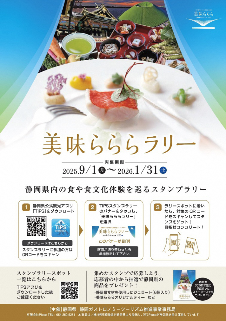静岡県内の豊富な食材や食文化体験を巡り、静岡の“おいしい”の背景を紐解き楽しむスタンプラリーが2025年9月1日から2026年1月31日まで開催されています。静岡県の美味と魅力を巡る旅をしたい方に必見です。
