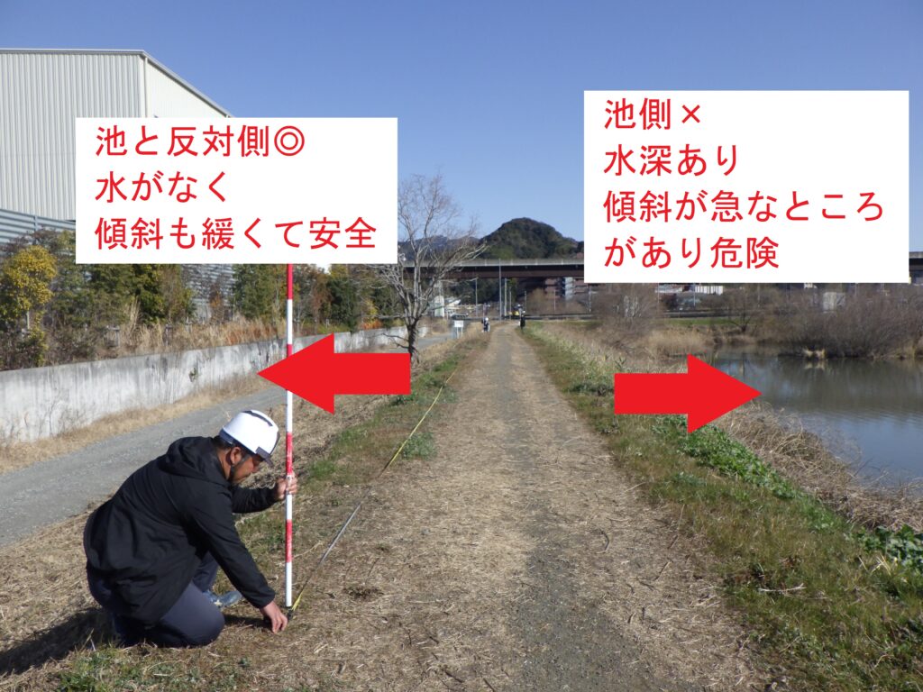 遊水地の堤防の池側は、普段から深く水が蓄えられているため、斜面から水面に転落する危険がありました。