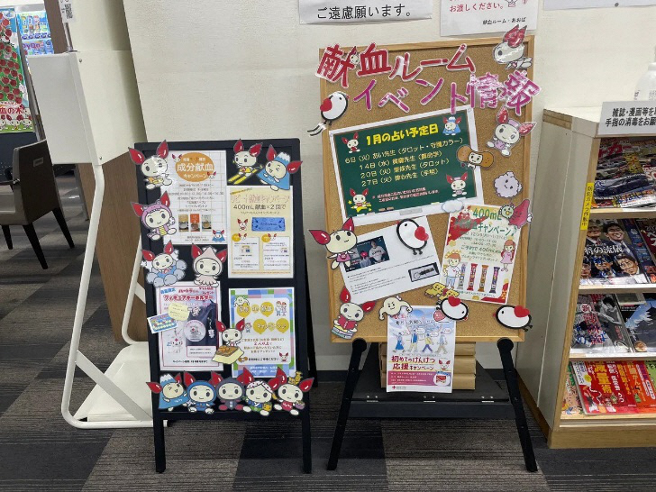 待合スペースの一角には、月ごとや長期にわたって行われているイベント情報が記載されていました。訪問させていただいた時期は占い師による占いを受けることができ、ぬいぐるみがもらえるキャンペーンが行われていました。「献血だ。誰かの役に立たないと」と身構えずに、「記念品もらいたいな~」くらいの軽い気持ちで献血に行ってみてはいかがでしょうか。