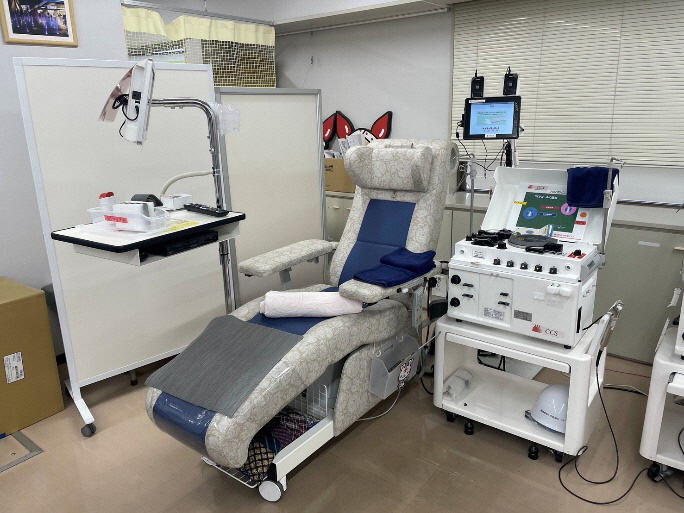 もう一つが成分献血です。これは血小板成分献血と血漿成分献血があり、成分採血装置を使用して血小板や血漿といった特定の成分だけを採血し、赤血球を再び体内に戻す方法です。そのため成分採血は全血献血と比較して身体への負担も軽く、多くの血漿や血小板を献血していただける特長があります。献血ルームのみで献血可能で、体格などにより個人差はありますが40分から90分ほど献血にかかります。
