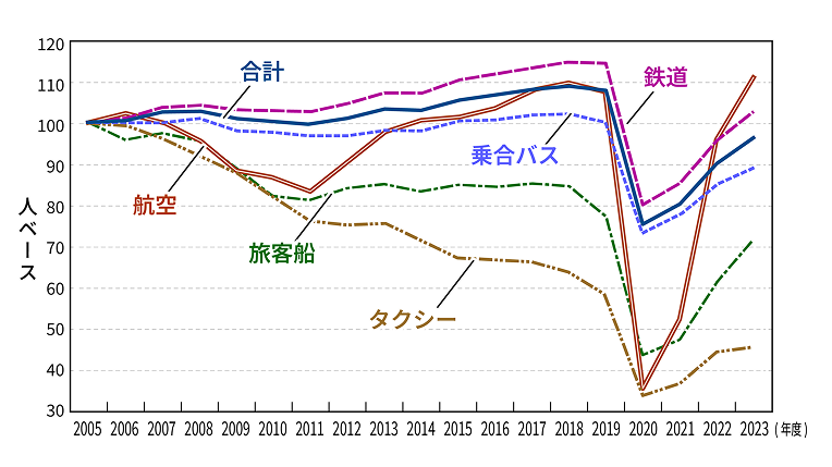 国内旅客輸送用の推移(人ベース・2005年度を100とした場合の動き)