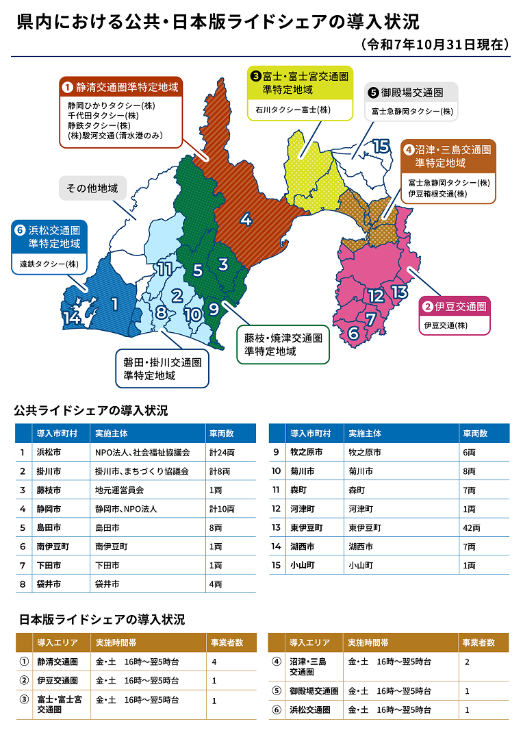 浜松市庄内地区では社会福祉協議会が運行主体となり、住民ドライバーが高齢者の通院や学生の通学を支えている。東伊豆町や小山町でも住民の移動を支える取り組みが進む。