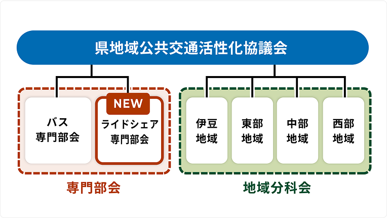 県は、県地域公共交通活性化協議会を設置し、四つの地域分科会、交通手段ごとの専門部会を結びつけ、広域調整やきめ細かな支援体制を築いている。