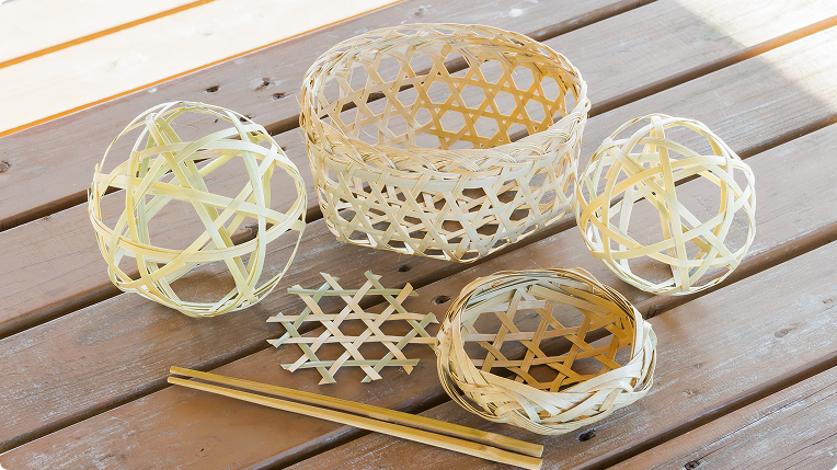 とくに人気が高いのが、星形や六角形が浮かび上がるように竹を繊細に編んで作る「竹まり」だ。コロンと丸いフォルムがかわいらしい。