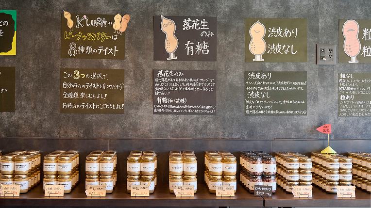 『K’LURA』のピーナッツバターを初めて楽しむという人には、「有糖(和三盆糖)、渋皮あり、粒なし」をお薦めしたいという。和三盆糖の上品な甘さに隠し味の渋みがマッチし、しっとりとした舌触りのピーナッツバターが口いっぱいに広がる。