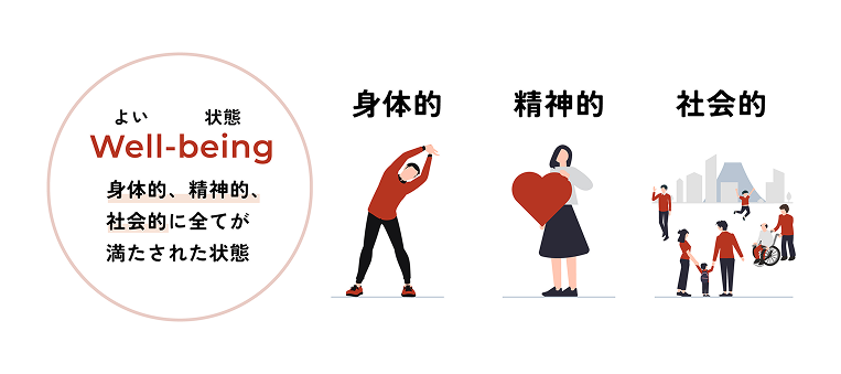 ウェルビーイングとは、経済的な豊かさだけでなく、心身の健康や暮らしの安心、人とのつながりなどを含めた「生きがい」や「満足感」を大切にする考え方である。
